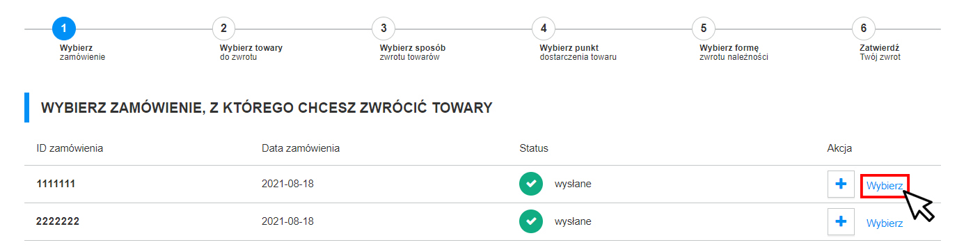 Jeśli posiadasz kilka zamówień złożonych w naszym sklepie internetowym wybierz to, w którym zostały zamówione produkty, które chcesz zwrocić. Kliknij przycisk "WYBIERZ", a zostaniesz pokierowany dalej.