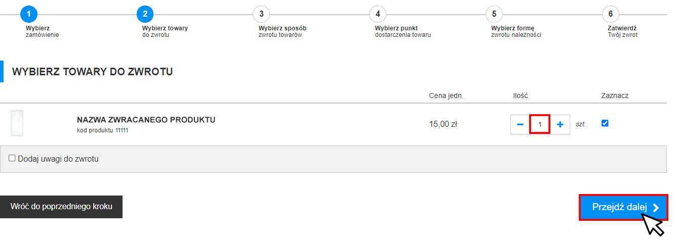 Wybierz produkt, który chcesz zwrócić oraz podaj jego ilość. Wystarczy kliknąć "+" by dodać 1 sztukę, lub "-" by odjąć sztukę, jeśli podałeś za dużą liczbę produktów do zwrotu. Następnie kliknij przycisk "PRZEJDŹ DALEJ".