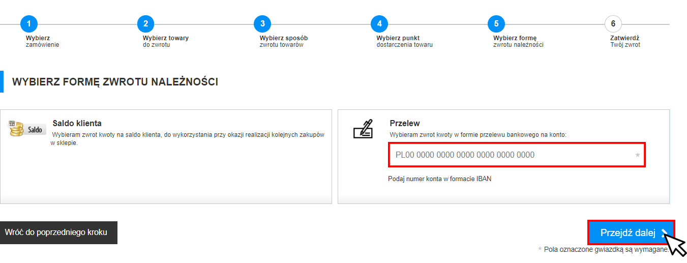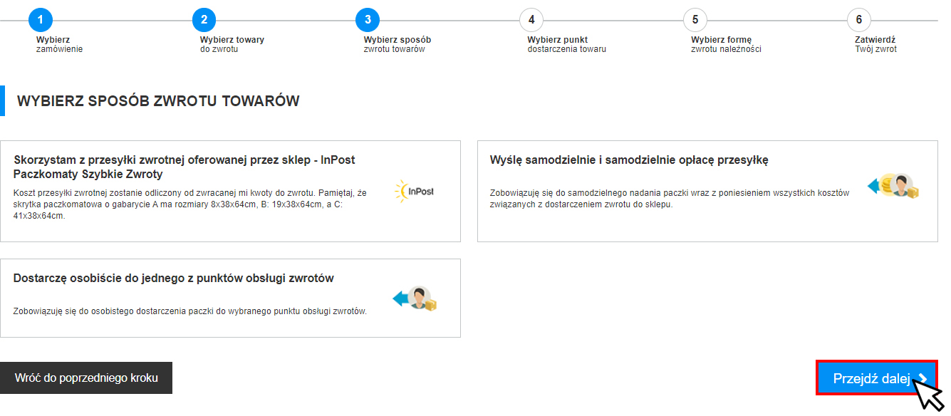 Wybierz jedną z trzech opcji zwrotu, kliknij na nią, a następnie wybierz przycisk "PRZEJDŹ DALEJ".