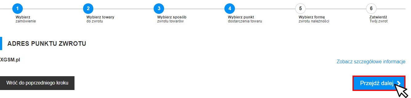 Na tym etapie znajdziedz nasz adres, na który musisz wysłać zwracany produkt. Kliknij przycisk "PRZEJDŹ DALEJ" by udać się do nastęnego kroku.