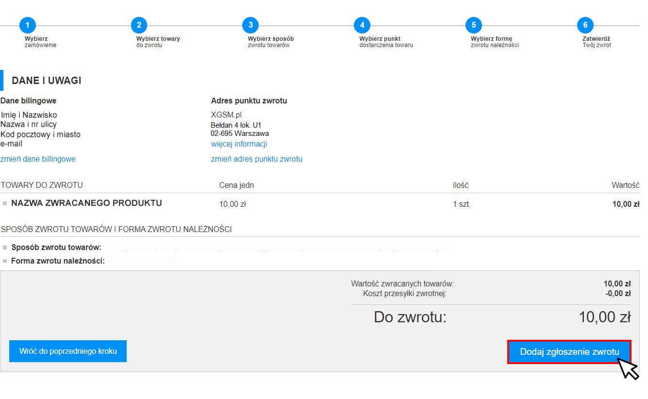 W ostatnim kroku znajdziesz podsumowanie swojego zwrotu. Jeśli wszystko się zgadza kliknij przycisk "DODAJ ZGŁOSZENIE". Jeśli jednak popełniłeś błąd, lub chcesz zmienić jedną z opcji, np sposób dostawy zawsze możesz kliknąć przycisk "WRÓĆ DO POPRZEDNIEGO KROKU" by zmienić dane.