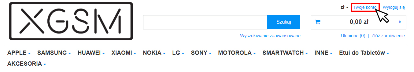 Po zalogowaniu na konto kliknij przycisk "TWOJE KONTO" znajdujący się w prawym górnym rogu.