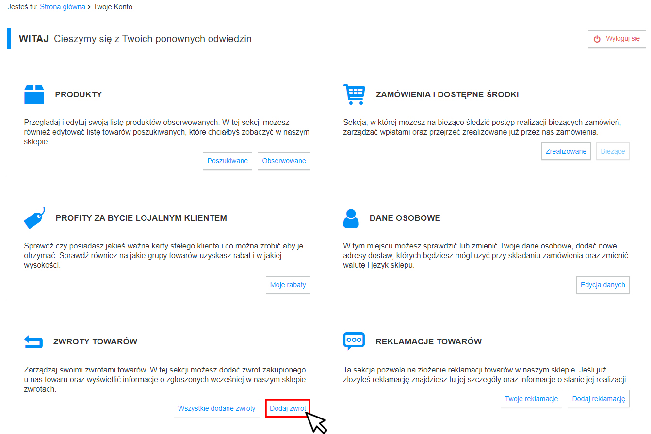Aby dodać reklamację kliknij przycisk "DODAJ ZWROT" znajdujący się na dole strony.