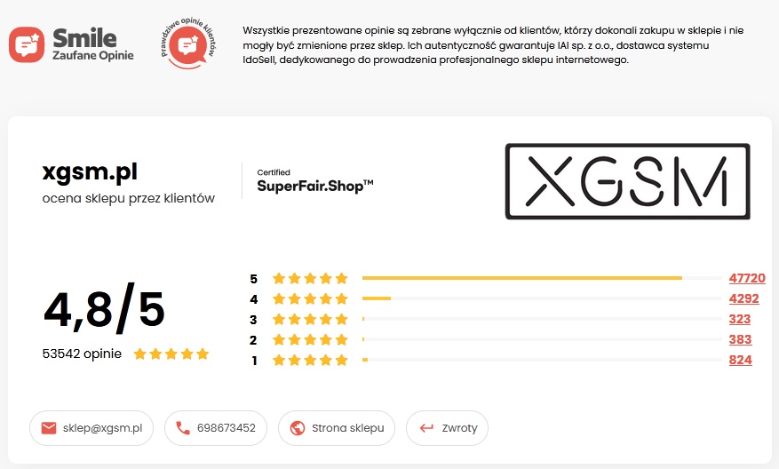 Po każdym zrealizowanym zamówieniu wysyłamy do naszych klientów wiadomość mailową z prośbą o ocenę przebiegu transakcji. Te opinie są później widoczne w serwisie Smile Zaufane Opinie IdoSell. IdoSell oznaczyło sklep XGSM.pl wyróżnieniem Certified SuperFair.Shop™, zarezerwowanym tylko dla najlepszych sklepów internetowych na platformie IdoSell.