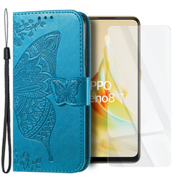 Zestaw Etui z klapką do Oppo Reno8 T, Motyl, Niebieskie + szkło