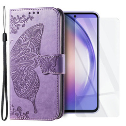 Zestaw Etui do Samsung Galaxy A54 5G, z klapką portfel, Motyl, Fioletowe + szkło