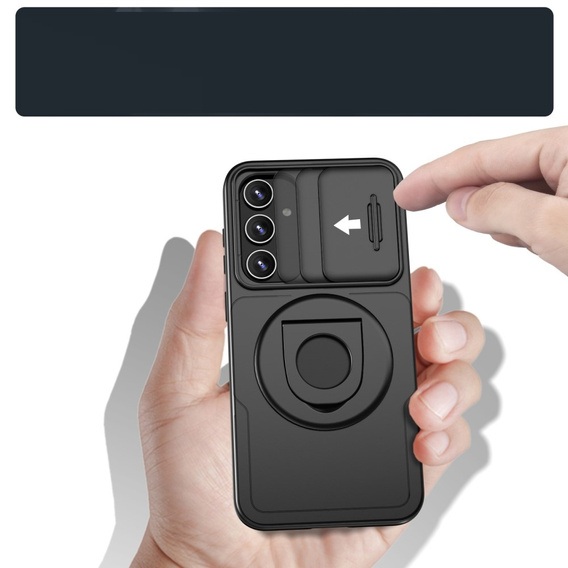 Etui do Samsung Galaxy S20 FE, Military Magnet, do MagSafe, czarne to hybrydowe etui wyprodukowane z połączenia poliwęglanu i termoplastycznego poliuretanu zapewnia bardzo dobrą ochronę przed uszkodzeniami mechanicznymi bez wyraźnego powiększenia gabarytów smartfona. Tylni panel wykonany jest z plastiku, a boczne krawędzie z elastycznego silikonu, dzięki czemu telefon z łatwością wchodzi w nakładkę. Dostęp do złącz i przycisków jest komfortowy i wpływa pozytywnie na jakość użytkowania. Etui posiada wbudowaną nakładkę magnetyczną, która umożliwia łatwe podłączenie telefonu do ładowarki MagSafe. Plecki posiadają praktyczny, metalowy uchwyt na palec, który umożliwia korzystanie ze smartfona bez użycia rąk.