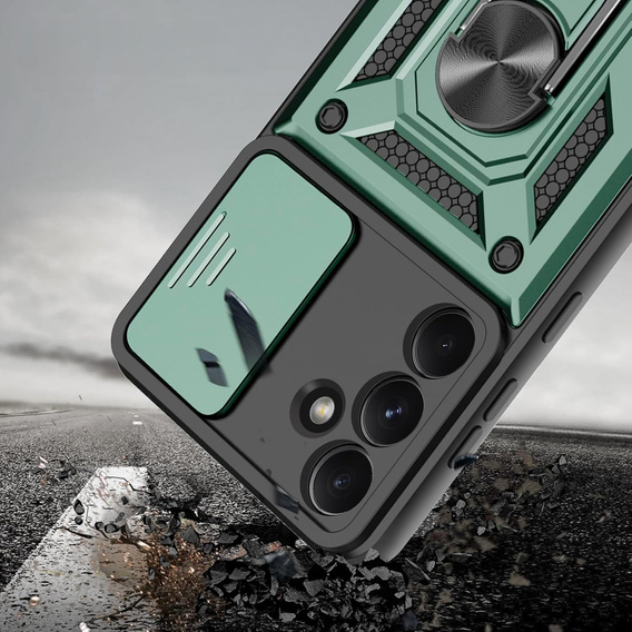 Etui pancerne do Samsung Galaxy A56, CamShield Slide, zielone + Szkło Hartowane 9H z opcją standu i magnetycznym uchwytem na palec. Obudowa jest wykonana z wysokiej jakości materiałów, jest w pełni funkcjonalna i zapewnia solidną ochronę urządzenia. Nakładka wykona jest z plastiku i giętkiej utwardzonej gumy TPU. Plecki posiadają praktyczny, metalowy uchwyt na palec który może służyć za mocowanie do samochodowego uchwytu magnetycznego na telefon. Obudowa posiada wzmocnione rogi i ranty, solidnie chroni telefon przed uszkodzeniami. Dodatkowa ramka ochrania boki i rogi smartfonu oraz skutecznie izoluje ekran od powierzchni, na których leży. Etui pasuje do konkretnego modelu urządzenia, posiada niezbędne wycięcia i przyciski, jest w pełni funkcjonalne. Przesuwny "Slider" - ruchoma przesłona pozwala zasłonić nieużywane obiektywy, ograniczając ryzyko ich uszkodzenia.