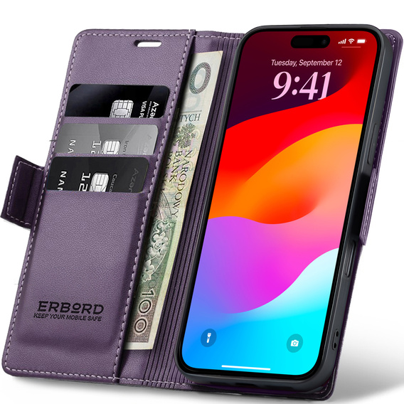 Etui do iPhone 17 Pro Max, ERBORD Glossy Litchi, portfel z klapką, fioletowe to precyzyjnie wykonany z wysokiej jakości skóry ekologicznej oraz plastiku pokrowiec z klapką. Obudowa jest niezwykle wytrzymała i zapewnia ochronę telefonu z każdej ze stron.