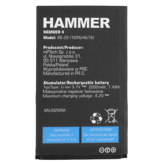 - 1 × Oryginalna Bateria do myPhone Hammer 4 / Hammer 4+ 2000mAh